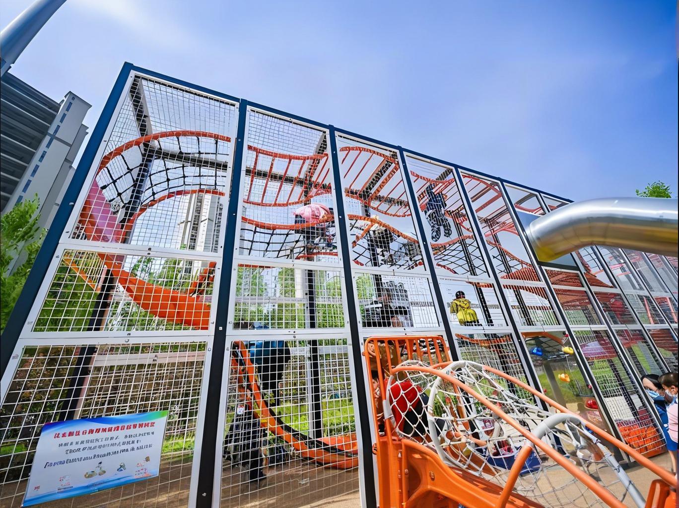 游乐设施采用圆角防撞设计,地面铺设缓冲材质(如沙池、EPDM),攀爬区设置防坠网;