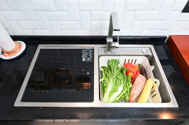 洗涤区收纳、省空间的一件“神器”。它相当于在一个空间安装了三样东西:水槽、洗碗机和果蔬净化器,这样你就不用去开辟别的橱柜空间安装一台洗碗机,又占用台面空间放一台果蔬净化器了。
