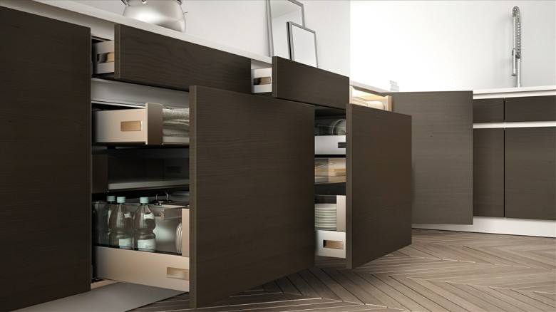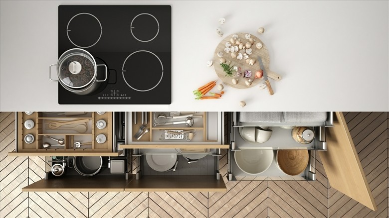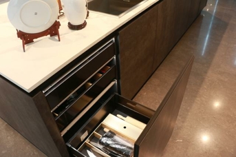 什么是“眼不见为净”?就是能放进柜子抽屉的,绝不放在台面上。台面一来要做饭,如果堆满东西,空间不够用;二来处理食材时产生的残渣汁水、烹饪产生的油烟等都会让暴露在外的架子、瓶瓶罐罐等变得油腻腻的,清洁起来很是繁琐。