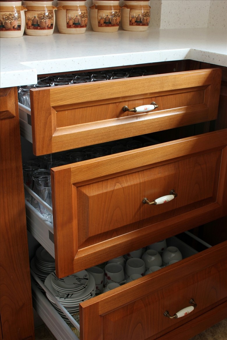 另外还需考虑的就是上轻下重,保证安全和拿取方便。上方橱柜适合储存使用频率低但较轻的物品。如厨用餐巾纸、茶叶、方便面、未用完的调料等。比较重的锅具就建议放在下方橱柜,以及一些易碎的物品,如红酒杯、咖啡杯、茶具等。