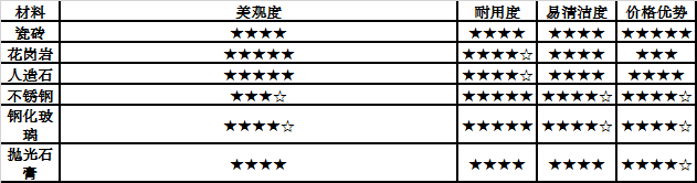 总体来说,瓷砖、不锈钢、石材这三种材质运用最为普遍。下面根据几种材料的特征总结的对比表,方便大家选择。