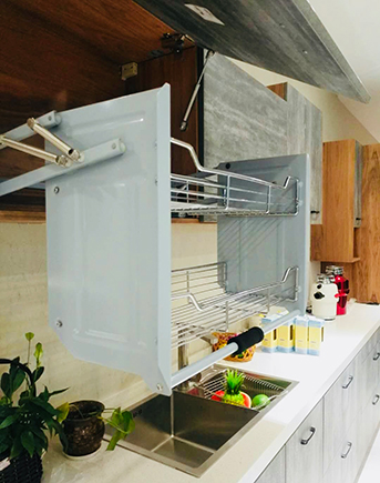同时,可以采用可拉伸的储物架、下拉式拉篮,增加收纳的空间,也方便老人快速找到物品,不用弯腰、垫脚。