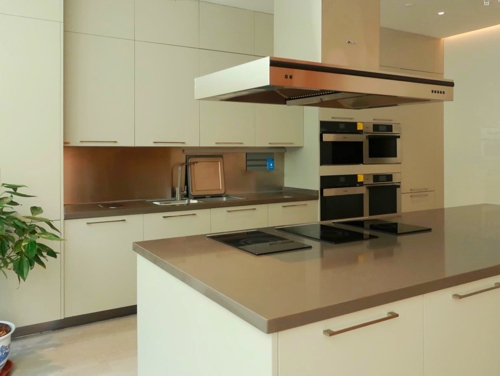我们常用的厨房台面材质有主要是天然石和人造石。天然石材中,大理石和石英石比较常用。由于是自然形成,它们都有“毛孔”,为更方便使用,现在很多石材表面都会进行防护封闭处理。市面上的天然石材台面,有的几百一米,有的上千一米,价格不便宜,即使有封闭处理,使用时也要爱惜,清洁时更要多加小心。