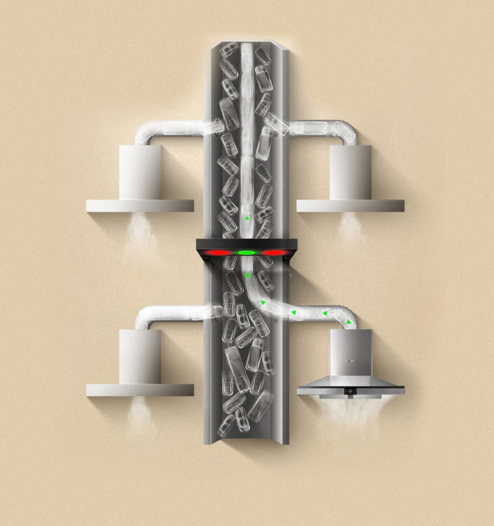 我们可以想像,从炉灶上升腾起来的油烟是集结起来的浩浩荡荡的队伍,它们从油烟机出口出发,穿过烟管,通过排风口进入公共烟道,起初宽阔的烟道可以任由这支大军驰骋向前,但在它们上升的过程中,慢慢和上层烟道中的油烟相遇,会形成拥堵局面,越往上,压力越大,能排出的油烟就越少。